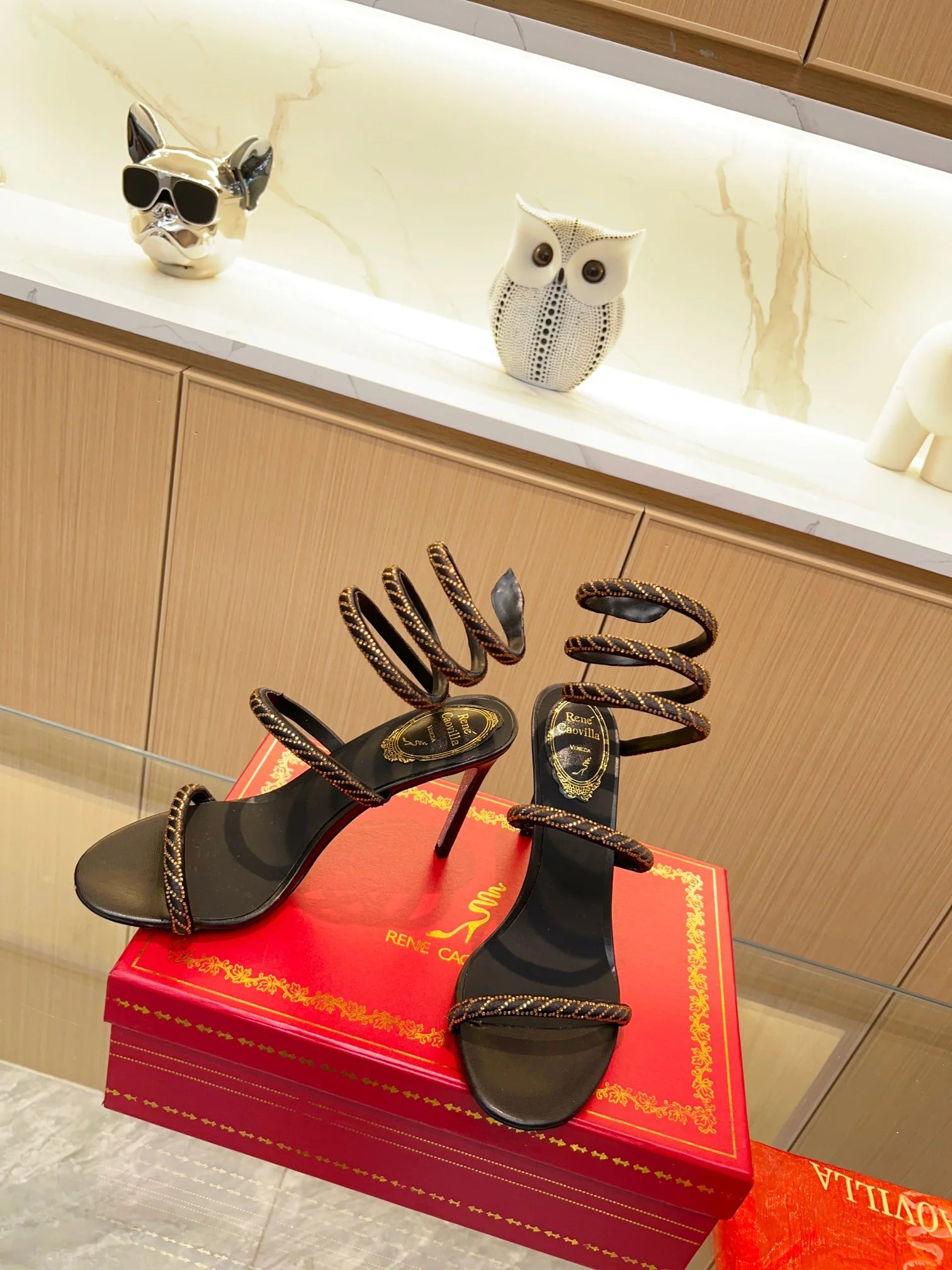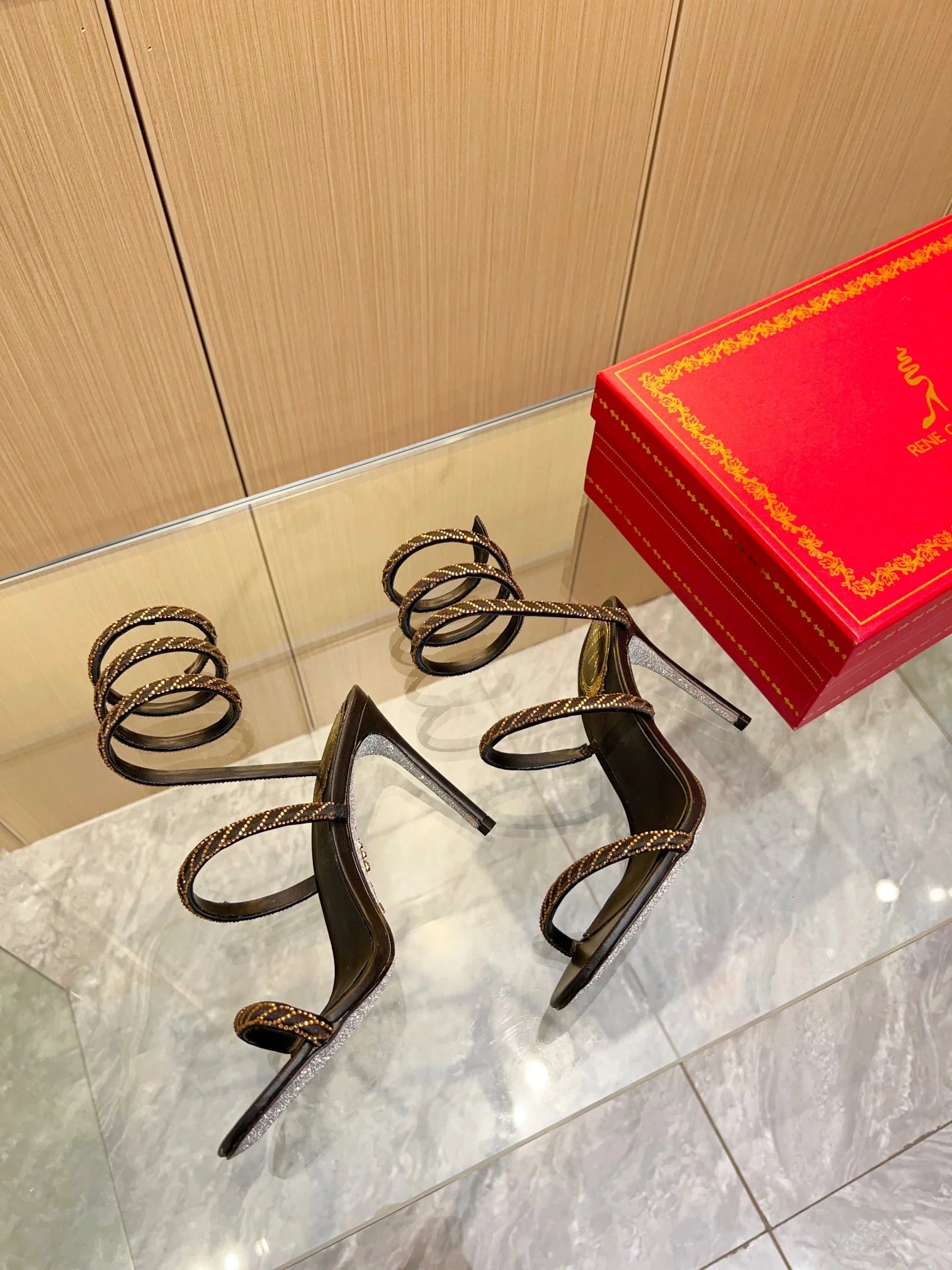 - Spiral ankle straps with multicolor crystal detailing