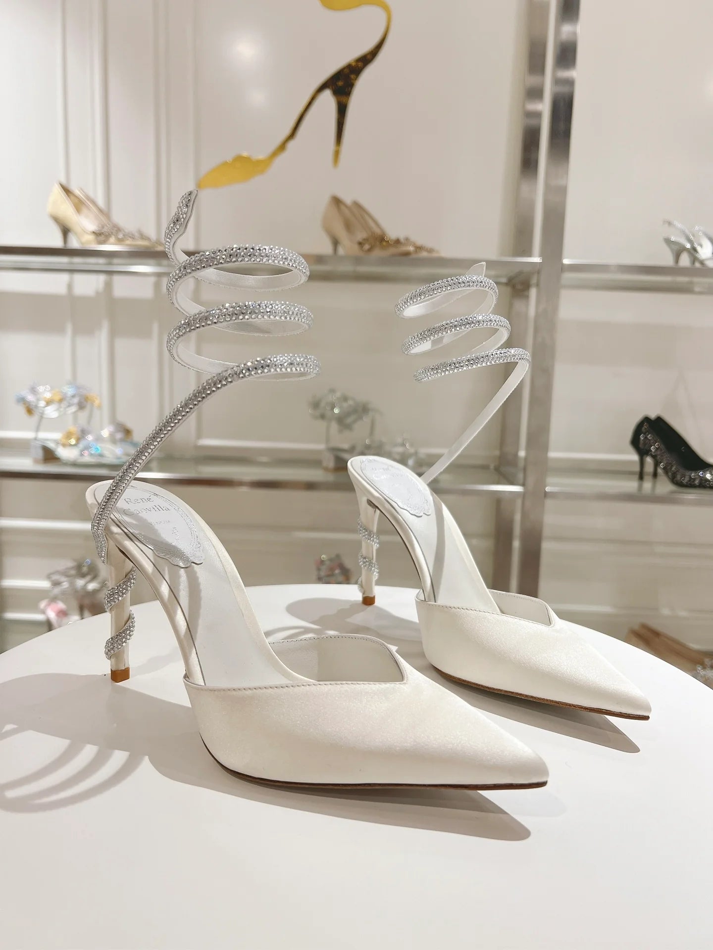 Elevate your look with these refined high-heel shoes designed for timeless elegance. Featuring a sleek pointed-toe silhouette and a smooth ivory finish, this design is enhanced by a striking spiral ankle strap adorned with delicate crystal detailing for a luxurious touch.