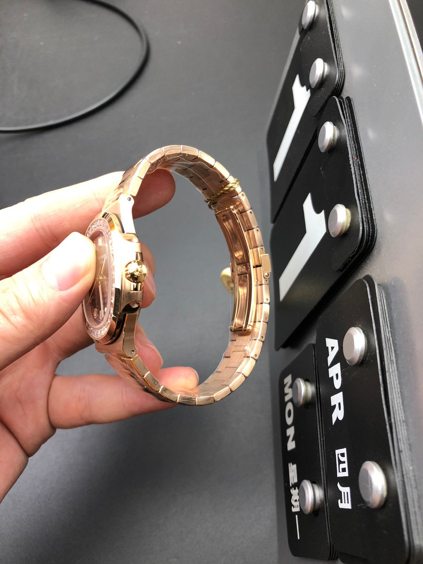 Luxury 40 mm automatic watch featuring a brushed rose gold finish and baguette-cut crystal bezel. The gray gradient dial includes slim hour markers and a precise date window at 3 o’clock. Crafted for timeless elegance, combining modern refinement with high-end craftsmanship.