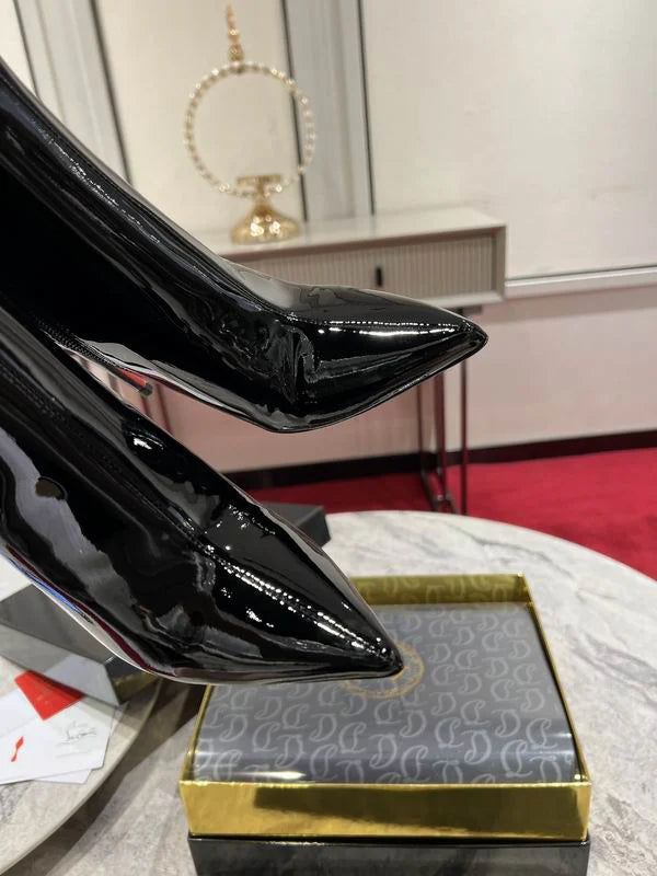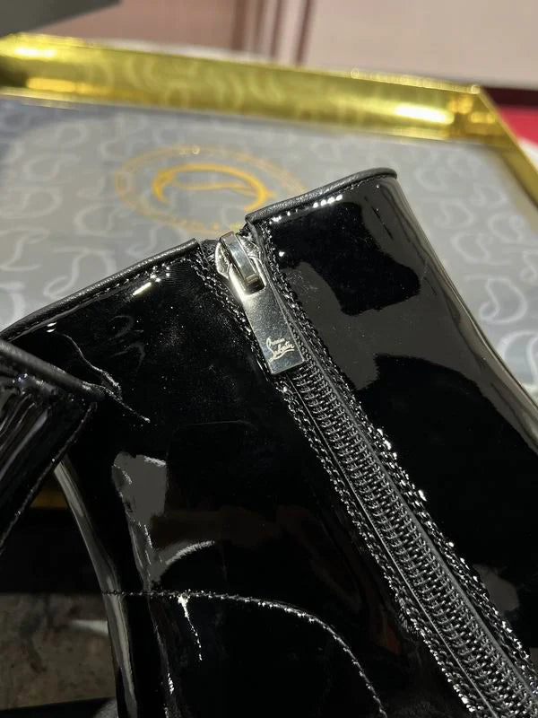 Sleek and modern, these ankle boots are crafted from glossy black patent leather for a bold, polished finish. Featuring a pointed toe and a slim stiletto heel, they create a refined silhouette, highlighted by the iconic red sole. A subtle metallic CL logo accent on the side adds a signature touch of luxury. Designed with a side zipper, they offer both elegance and easy wear.