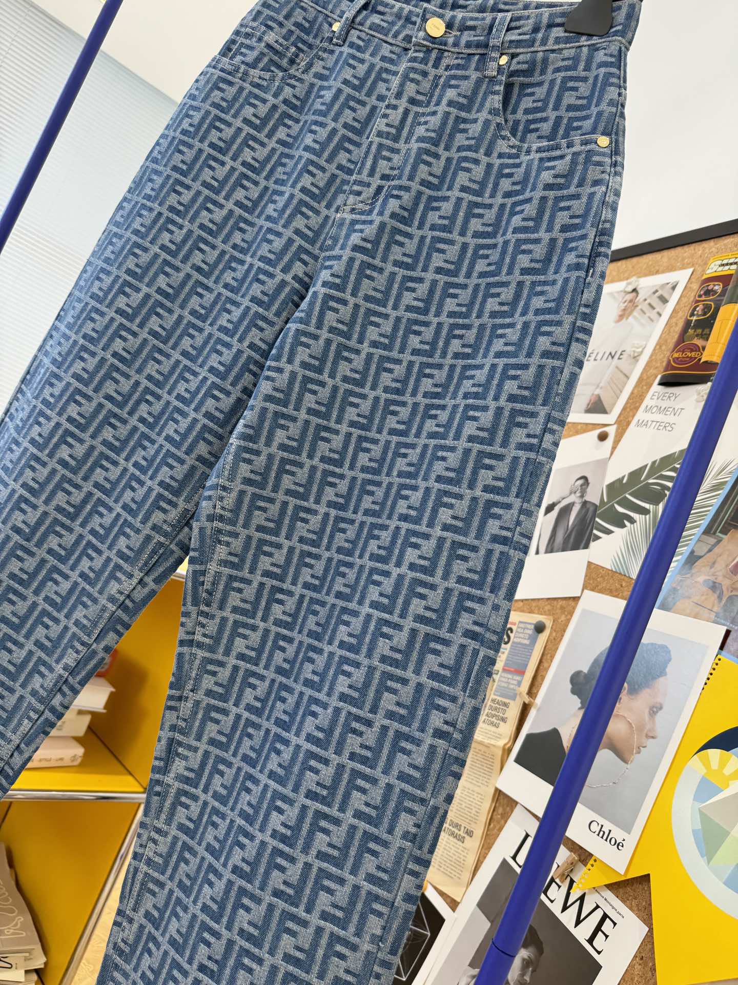 These straight-leg denim jeans feature an all-over geometric monogram-inspired pattern that adds a bold, elevated touch to a classic silhouette. Designed with a mid-to-high rise waist and a clean, structured fit, they balance statement style with everyday versatility.